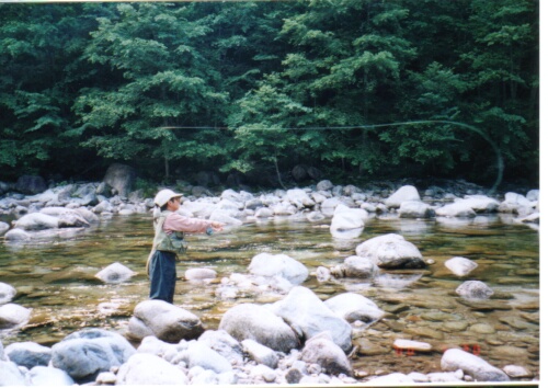 早速準備を済ませ、川に入る。上流を見つめて、ポイントの確認をしゆっくりと釣り上がる。